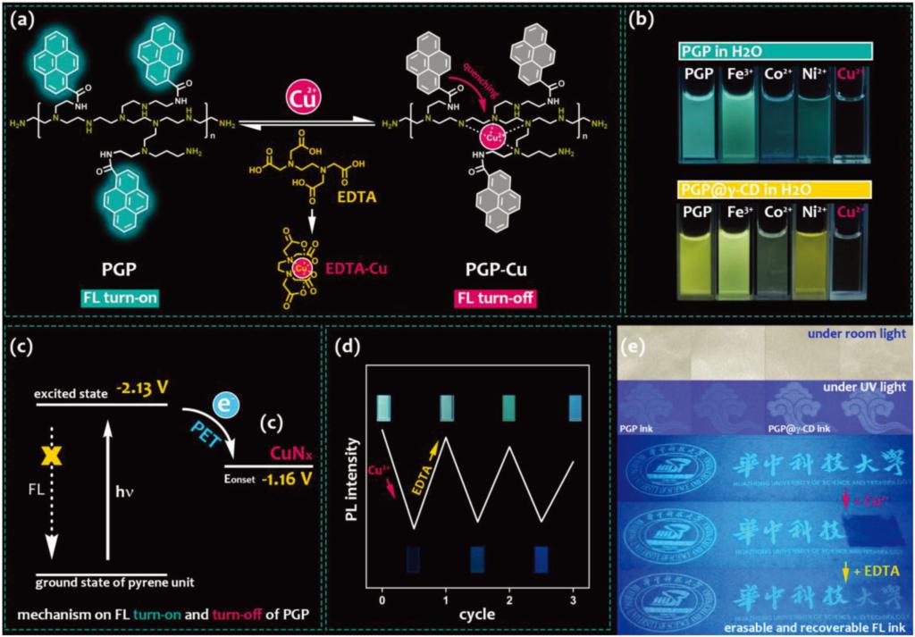 PGP含有大量末端氨基,这些氨基作为路易斯碱可与Cu2+原位形成过渡金属配位中心,配位中心有可能作为电子受体通过光诱导电子转移(photoinduced electron transfer)猝灭附近芘单元的荧光;引入与Cu2+具有更强配位能力EDTA,破坏芘附近猝灭中心,又可以恢复PGP中芘分子的发光。基于这一原理,PGP被还设计为一种具有多次擦除/显影特性的荧光墨水。利用PGP墨水打印的荧光图案(图2)可通过循环喷洒Cu2+水溶液和EDTA水溶液实现多次的荧光擦除和显影——这一特性完全在常用的纸张上实现,显示出PGP潜在的实际应用前景。