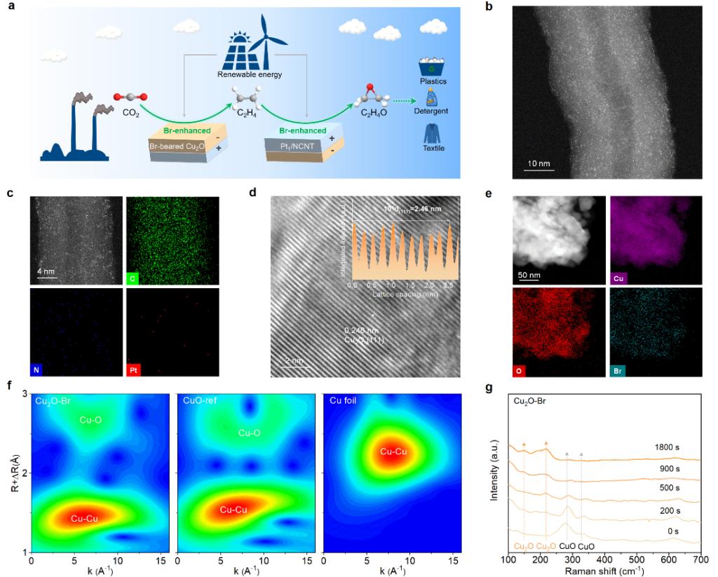 针对上述问题,游波、夏宝玉教授团队报道了一种溴介导的双增强策略(图2),以Pt基单原子 (Pt1/NCNT)和含Br的多孔Cu2O作为阳极和阴极电催化剂,旨在同时促进C2H4到EO和CO2到C2H4的转化,从而提高CO2到EO的产生。系列物化表征以及理论计算表明,相对于传统的氯介导路径,Br2/HBrO在Pt1/NCNT催化剂上的生成更有利,有助于C2H4转化为EO。同时,具有强亲核性的Br−有效地保护了Cu2O中的活性Cu+物种,提高了CO2到C2H4的转化率。使得最终串联系统中CO2到EO总的FF高达41.1%。