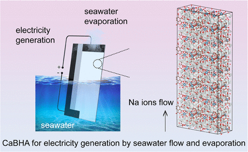 图1。海水流动和蒸发发电策略。具有亲水和带电亚纳米通道的CaBHA单晶,用于反离子的单极溶液流动,以在海水中产生流动电势。
