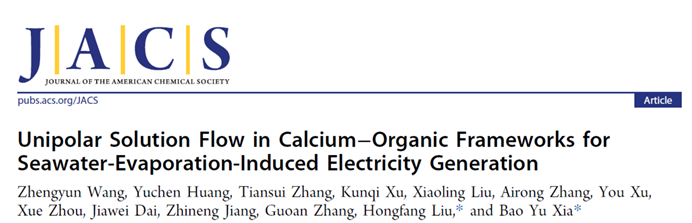 2024年1月5日,《美国化学学会志》(J Am Chem Soc)期刊在线刊发了化学与化工学院刘宏芳教授、夏宝玉教授团队最新研究成果“钙基金属有机框架中的单极性溶液流动诱导海水蒸发产电”(Unipolar Solution Flow in Calcium−Organic Frameworks for Seawater-Evaporation-Induced Electricity Generation)