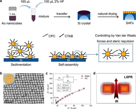 发展高灵敏、高重现性原位光谱电化学技术对于深入理解电化学界面的构效关系至关重要。衰减全反射表面增强红外吸收光谱(ATR-SEIRAS)被广泛用于研究甲烷氧化、氢气氧化/析氢和CO2/CO还原等电化学反应过程。目前,ATR-SEIRAS技术中所使用的金属薄膜大多是通过化学沉积法制备的,金属薄膜以及单个金属纳米粒子的形貌不可控,进而导致SEIRAS技术的灵敏度和重现性较差,难以获得电化学反应的完整信息。