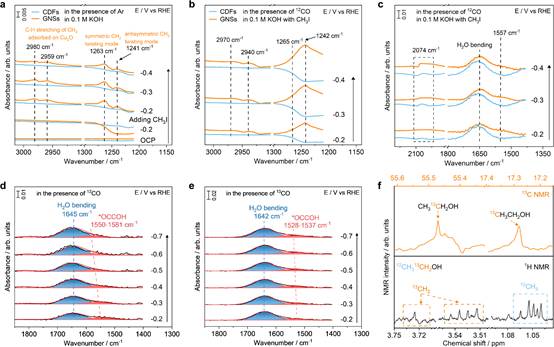 基于此,杨旋教授团队创新性地利用自组装技术制备了高度有序的菱形金纳米立方体超晶格薄膜(GNSs),并应用于SEIRAS技术。通过控制自组装过程中氯化十六烷基吡啶(CPC)的浓度,金超晶格薄膜的混乱度和纳米立方体之间的间距得到了精准调控。当CPC浓度为5 mM时,金纳米立方体之间的间距为5-8 nm,此时金超晶格薄膜界面的电磁场强度最强,其SEIRA效应相比于传统化学沉积法制备的金膜(CDFs)提高了约1个数量级,并且原位测量的重现性得到了大幅提升。利用GNSs作为SEIRAS技术的增强基底,研究了Cu基催化剂表面的CO电化学还原反应(CORR),精准捕获到CO电化学还原反应中C-C偶联的关键反应中间物种*OCCOH,结合同位素失踪技术和NMR技术,揭示了Cu基催化剂表面CORR的反应路径和反应机理。