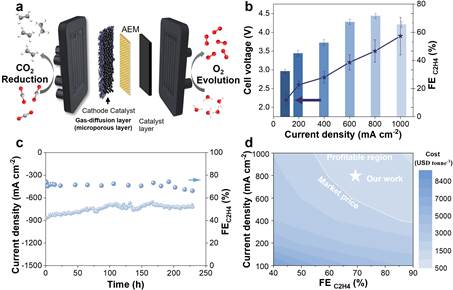 为解决这一问题,研究人员首先采用理论计算和分子动力学模拟解析了催化剂在电化学条件下的重构行为以及对乙烯选择性影响的关键因素(图一)。进而根据催化剂的重构行为和影响乙烯性能的关键因素,定向设计了一种能够高效电催化二氧化碳还原为乙烯的铜基催化剂(TS-Cu)。得益于先进催化剂的设计,该铜催化剂能够在-0.9 V vs RHE的电位下以800 mA cm-2的电流密度高效催化二氧化碳转化为乙烯(法拉第效率大于70%)。此外,在膜电极系统中,该催化剂在3.5 V槽压下实现了超过72%的法拉第效率和230 h的稳定性(图二)。最后,研究人员根据当前原料成本估计了该催化剂的工业化前景,发现系统每电解产生1吨乙烯将获得180美元的盈利(图二),有望促进二氧化碳电解技术工业化应用。