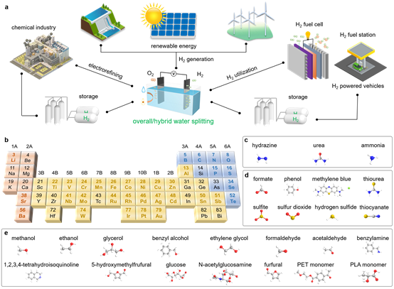 氢能因具有高能量密度和零碳排放等优点,是实现我国“碳达峰、碳中和”目标的理想能源载体。在众多制氢方法中,利用可持续能源如太阳能、风能等产生的电力驱动水分解是一种绿色、可持续的制氢气途径。但目前仍存在1)两极催化剂功能单一和2)阳极过电位高及其产物价值低的问题。