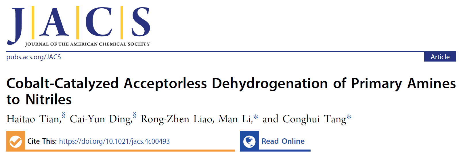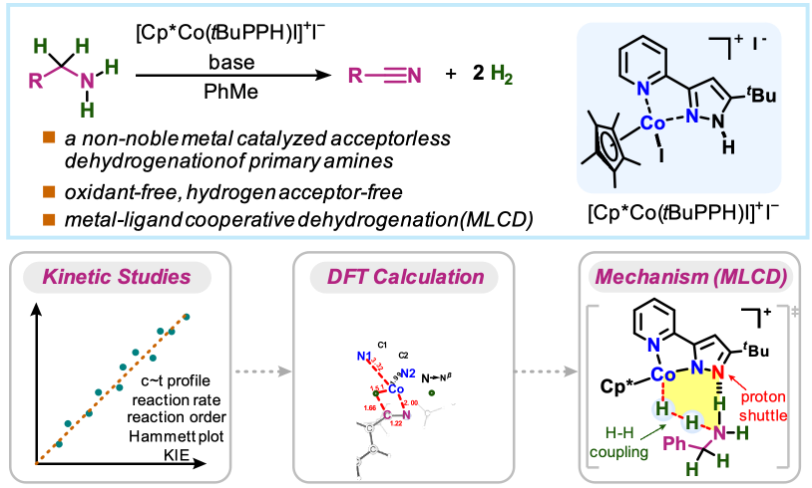 近日,华中科技大学化学与化工学院唐从辉课题组和廖荣臻课题组的最新合作研究成果“Cobalt-Catalyzed Acceptorless Dehydrogenation of Primary Amines to Nitriles”在国际顶级期刊《美国化学会志》(J. Am. Chem. Soc.)上刊发。