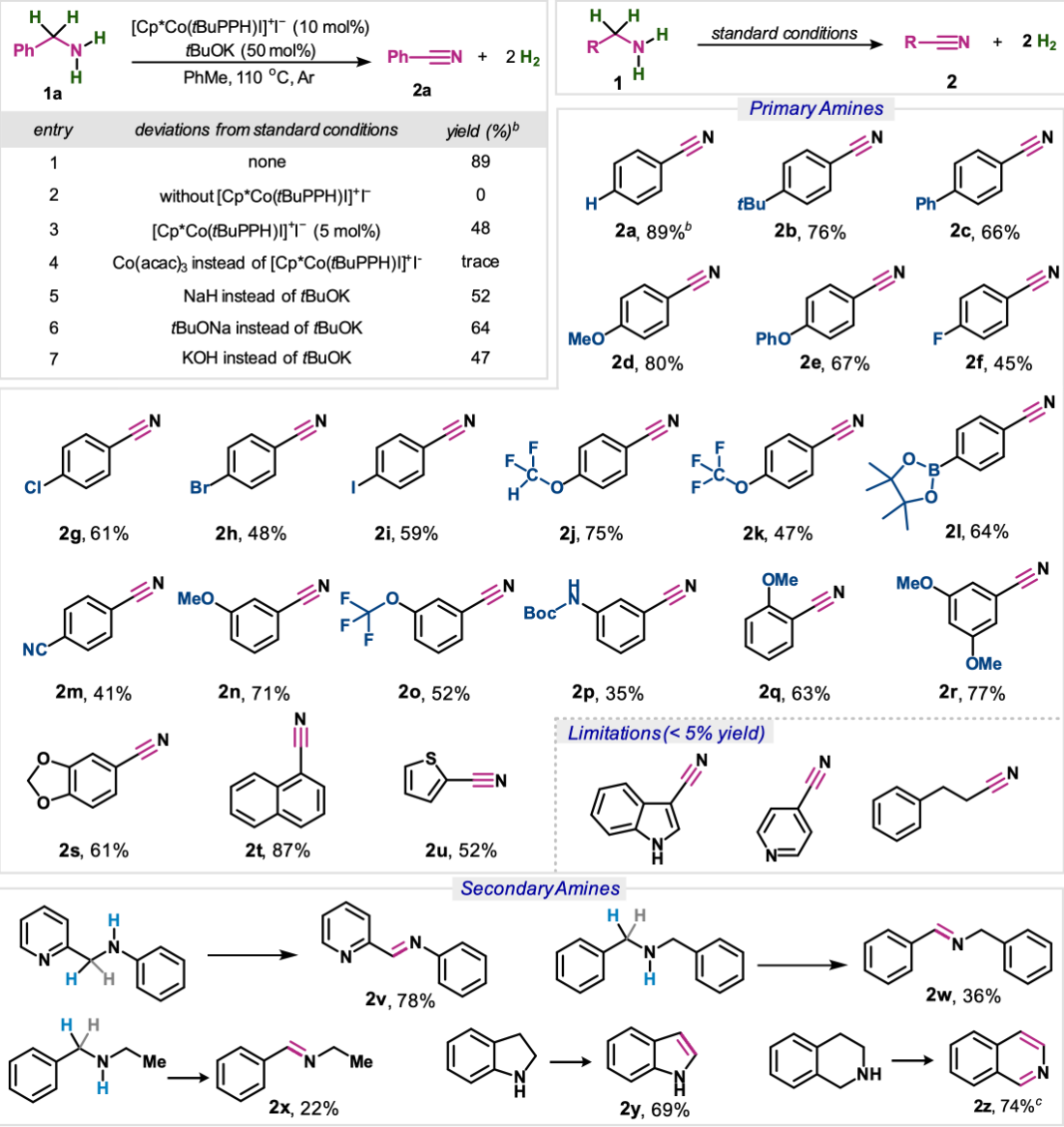 作者首先对反应的条件进行了筛选,实验发现使用[Cp*Co(tBuPPH)I]+I−作为催化剂,t–BuOK为碱,甲苯为溶剂,在110 °C下反应24 h,一级胺脱氢的最佳效率可达89%(图2)。对照实验表明,催化剂和碱对反应效率有直接影响。而且,该反应具有良好的一级胺底物普适性,具有多种不同电性取代基的苯甲胺,杂环甲胺等都可以在该体系中兼容,以中等至良较好的收率得到对应的腈类化合物。此外,该体系对二级胺底物也具有良好的脱氢效果,获得对应的亚胺产物。