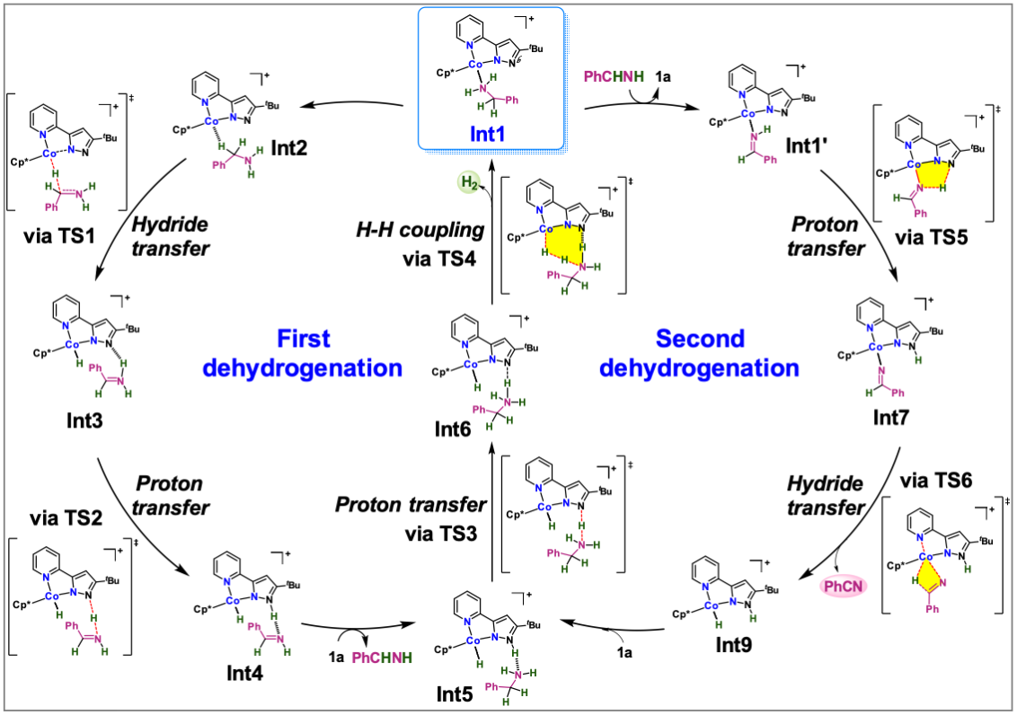 在第二分子脱氢反应中,Int1中与Co中心配位的苄胺被亚胺取代形成配合物Int1'。Int1'首先经由过渡态TS5将亚胺N−H上的质子转移到吡唑配体的Nβ上,形成Co−N中间体Int7。Int7通过四元环过渡态TS6以“内球式”机理完成亚胺C−H的氢负向Co中心的转移,生成Co−H中间体Int9,并释放出产物苯甲腈。随后,Int9通过氢键与另一分子PhCH2NH2络合形成Int5,Int5依次经历质子转移(TS3)和H-H偶联(TS4)步骤,放出第二分子H2并再生Int1参与下一个循环。