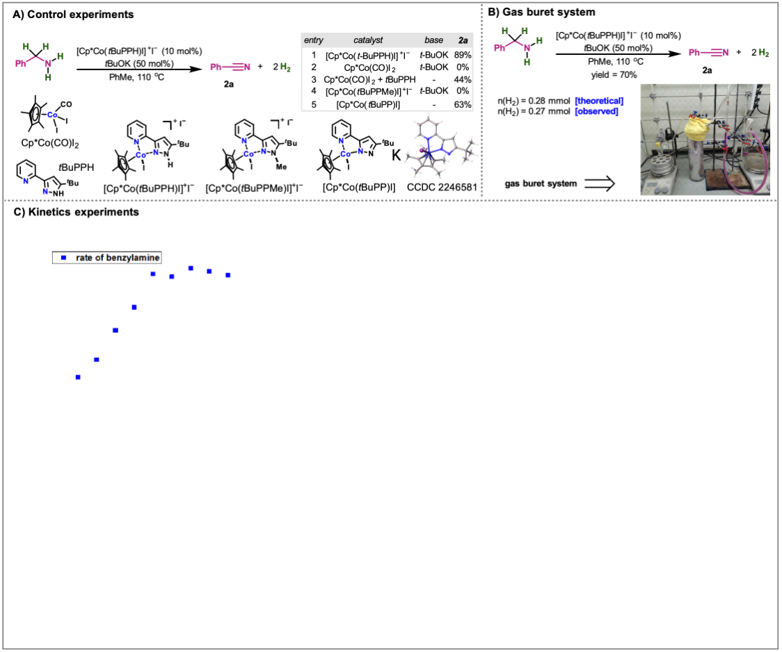 作者通过控制实验、气体收集实验、动力学实验对反应机制进行了仔细的实验研究。控制实验(图3. A)表明一级胺的脱氢需要金属和配体的协同作用,碱是钴催化剂的活化剂,脱掉一分子HI的催化剂是催化活性物种。作者还设计了氢气收集装置(图3. B),几乎和理论产量等量的收集到了产生的氢气。在动力学实验中,作者为了保证实验数据的准确性,将反应时间控制在较短的时间内。首先,反应速率和底物浓度的关系研究表明,在一定的浓度范围内,反应速率和底物浓度呈正相关,底物浓度过高时,反应速率不再受浓度影响。反应级数研究表明,底物和催化剂的反应级数为一级,而碱的反应级数为零级。哈密特实验展示了该催化体系具有明显的给电子效应。动力学同位素实验则说明C–H的脱去是反应速率限制步骤。