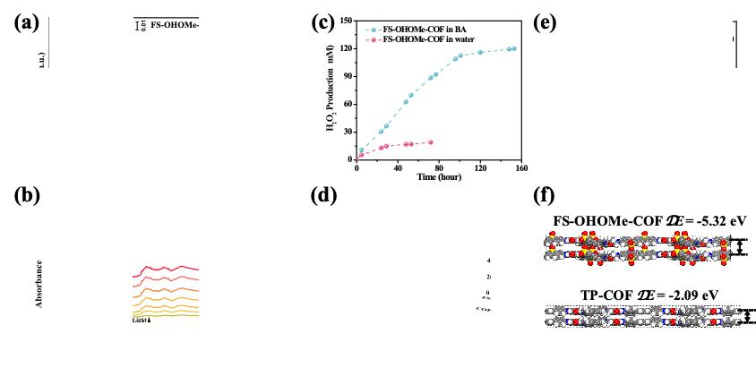 制备得到的FS-OHOMe-COF表现出较低的激子结合能、较长的激发态寿命和较高的光稳定性(图2)。在光照条件下,该COF能高效且稳定地生成过氧化氢,可见光下过氧化氢生成速率可达1.0 mM h-1(图3),72小时光照后过氧化氢浓度可达19 mM并在420 nm处取得最大的外部量子效率,为9.6%。在模拟太阳光下,计算得到太阳能-化学能转换效率为0.58%。经过48小时的光照后,产生的溶液可直接用于降解有机污染物(图4d)。更为重要的是,FS-OHOMe-COF具高的结晶度,更强的层间作用力(图4f),以及更高效的电荷传输效率,使其获得了更高稳定性,能够在光照下持续稳定运行至少192小时(图4ce)。