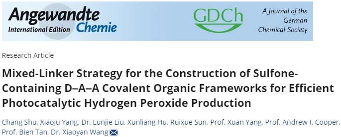 近日,我院谭必恩教授和王笑颜副研究员的最新研究成果Mixed-linker strategy for the construction of sulfone-containing D-A-A covalent organic frameworks for efficient photocatalytic hydrogen peroxide production在国际顶级期刊《德国应用化学》Angewandte Chemie)杂志刊发。
