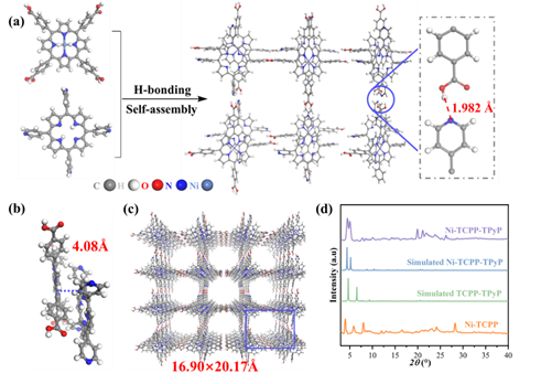 为此,作者通过引入镍卟啉作为还原位点和吡啶基卟啉作为氧化位点,采用溶剂挥发自组装法制备了一种分子结氢键有机框架光催化剂Ni-TCPP-TPyP,实现了高效人工光合CO2还原的目标(图1)。该催化剂通过氢键和p-p相互作用成功地自组装形成了高结晶结构,有效提升了材料电荷传输能力。同时高度有序的结构有利于精确构建还原和氧化中心形成分子结,进而提高材料电荷分离能力。