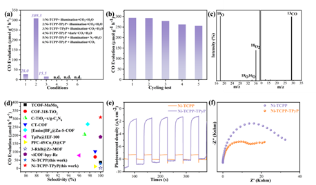 Ni-TCPP-TPyP表现出优异的光催化CO2还原活性,CO的生成速率最大可达到309.3 μmol g-1 h-1(选择性,∼100%),远高于单组分催化剂Ni-TCPP。对照实验和同位素标记实验表明CO2和H2O分别被用作还原半反应和氧化半反应的反应物(图2a和c)。Ni-TCPP-TPyP的催化活性在已报道的有机光催化剂中处于领先水平(图2d)。光电流响应测试和电化学阻抗谱测试表明氧化还原分子结在增强材料载流子传输方面发挥了关键作用。