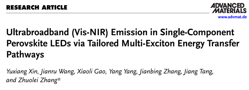 Y. Xin, J. Wang, X. Gao, Y. Yang, J. Zhang, J. Tang, Z. Zhang, Ultrabroadband (Vis-NIR) Emission in Single-Component Perovskite LEDs via Tailored Multi-Exciton Energy Transfer Pathways. Adv. Mater. 2025, 2501658. https://doi.org/10.1002/adma.202501658