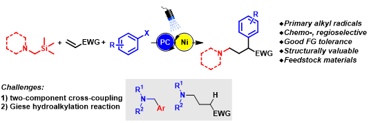 近日,华中科技大学的袁伟明课题组在镍/光氧化还原催化下α-氨甲基三甲基硅为自由基前体成功实现了一级烷基自由基参与的烯烃12-双碳官能团化反应。通过采用极性匹配增强效应以及形成稳定的一级氨基烷基自由基的策略有效抑制了两组偶联以及Giese类型氢化副反应(图2)。该反应条件十分温和,无需外加任何碱或添加剂等,整个过程呈现氧化还原中性。反应具有的官能团兼容性和化学选择性。该方法廉价易得的原料出发,只需一步便高效合成α-芳基取代的γ-氨基丁酸衍生物