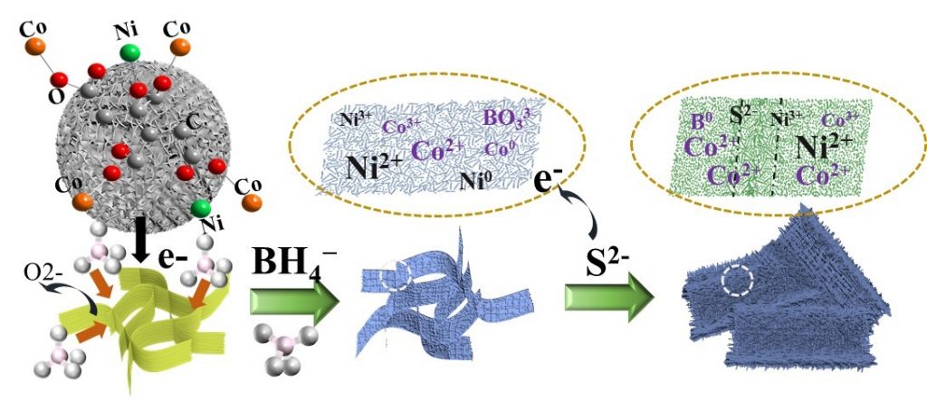 华中科技大学夏宝玉课题组通过氧化还原策略来调控双金属Co-Ni MOF纳米薄片的结晶性和电子结构来增强材料法拉第电容。依次通过硼化和硫化处理后,得到稳定低价的混合价态的Co-Ni MOF衍生物(Co-Ni-B-S)。该衍生物不仅保存了原始Co-Ni MOF的结构完整性,活化后表现为部分晶态和非晶态共存的结构,有利于实现优异的电化学性能。测试结果表明:(1)活化后的Co-Ni-B-S样品在1 A g-1的电流密度下,可达到1281 F g-1的高比电容;(2)在20 A g-1的电流密度下,可达到802.9 F g-1的高比电容,具有出色的倍率性能;(3)经过10,000次循环后容量保留率可达到92.1%,表现出优良的循环性能稳定性。基于Co-Ni-B-S电极制造的储能装置在功率密度为857.7 W kg-1时表现出50.0 Wh kg-1的高能量密度,在12 A g-1下经过5000次循环,容量保持率可达到87.7%。同时,在以活性炭为负极组装的超级电容器器件的测试中,发现器件在水系电解液中可以得到1.7 V的高电压,给此材料的应用提供了更多的可能性。