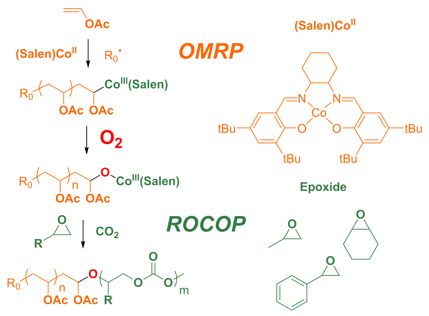 研究团队以含羧基三硫酯化合物作为二氧化碳共聚反应(ROCOP)和可逆加成-断裂链转移聚合(RAFT)的双功能链转移剂,一步合成了一系列聚丙烯酸酯-b-PPC嵌段共聚物 (Angew. Chem. Int. Ed. 2018, 57, 3593-3597)。团队通过持续创新研究,以氧气为分子开关,实现了可控/活性自由基聚合(CRP)到二氧化碳共聚反应(ROCOP)的智能转化,一步合成了聚醋酸乙烯酯-b-PPC嵌段共聚物。该新型嵌段共聚物在一定的条件下可发生水解,具有全生物降解特点,有望作为PPC与淀粉、纤维素共混复合的相容剂,实现PPC的高性能化、低成本化加工。研究工作得到了国家重点研发计划(2016YFB0302400)和国家自然科学基金青年项目(21604027)资助。