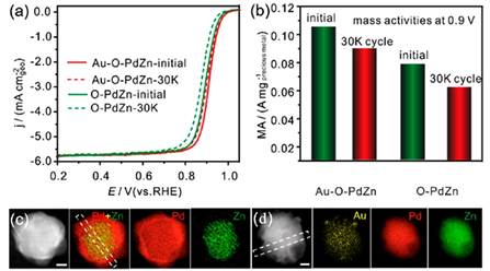 图1. Au修饰的O-PdZn有序金属间化合物催化剂的性能评价与结构分析