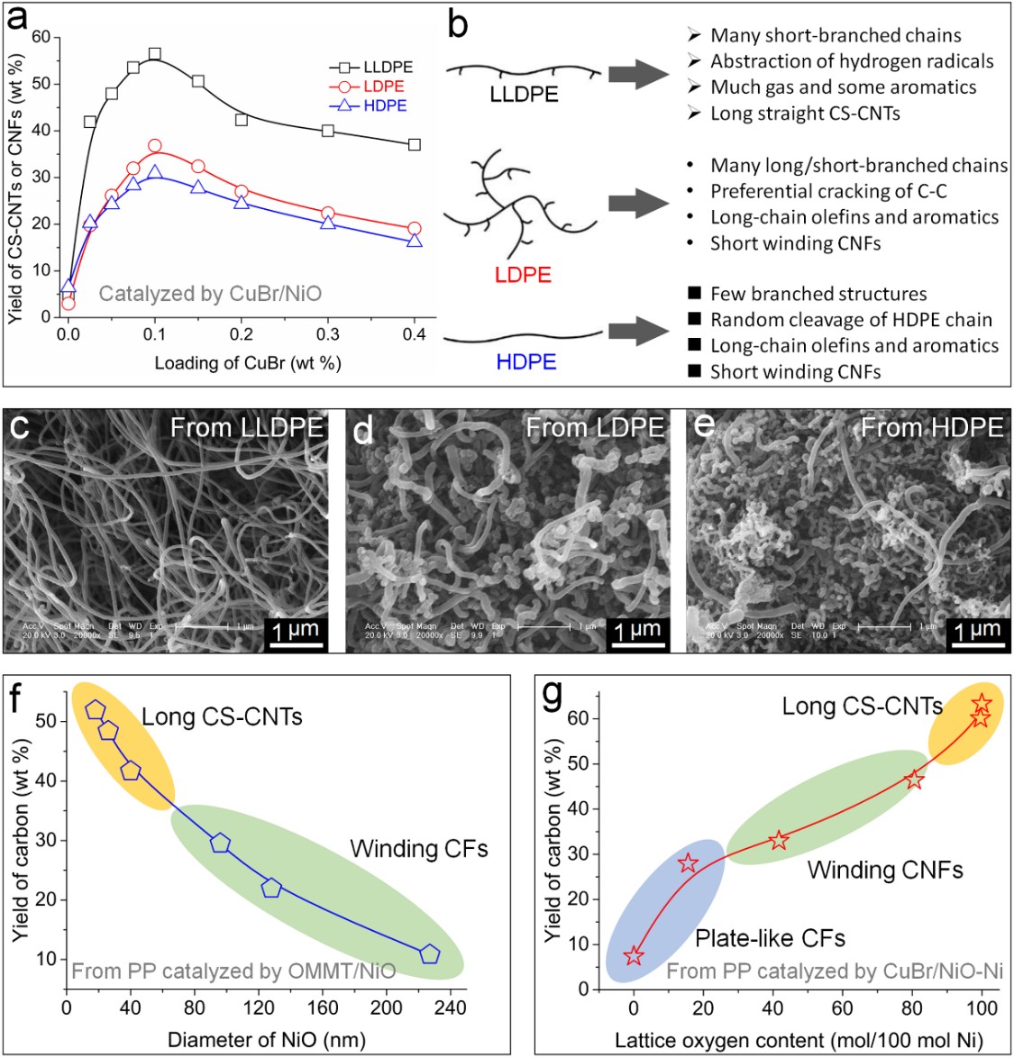图4组合催化碳化中,聚合物组成与分子链结构、催化剂的尺寸和种类、晶格氧等对聚合物碳化反应的影响(参考文献:Angew. Chem. Int. Ed.2005,44, 1517;Chem. Mater.2005,17, 2799;Chem. Eur. J.2007,13, 3234;Carbon2007,45, 449;Polymer2009,50, 6252;J. Phys. Chem. C2010,114, 13226;Appl. Catal. B: Environ.2012,117-118, 185;Appl. Catal. B: Environ.2014,147, 592;Compos. Sci. Technol.2018,164, 82)