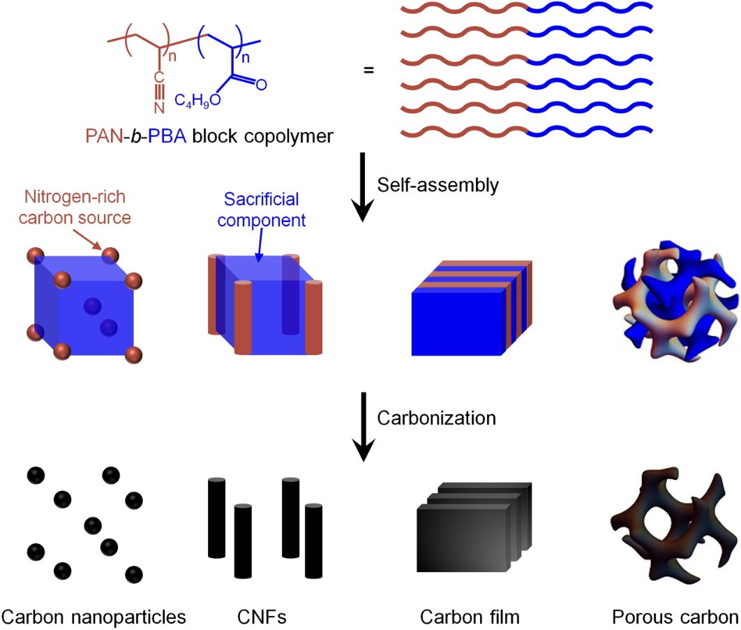 图3Krzysztof Matyjaszewski教授课题组提出的共聚物模板碳化法实现聚丙烯腈(PAN)可控碳化制备碳材料(参考文献:J. Am. Chem. Soc.2002,124, 10632;J. Am. Chem. Soc.2005,127, 6918;Angew. Chem. Int. Ed.2014,53, 3957;Macromolecules2017,50,2759;Prog. Polym. Sci.2019,92, 89;Adv. Mater.2019,31, 1804626)