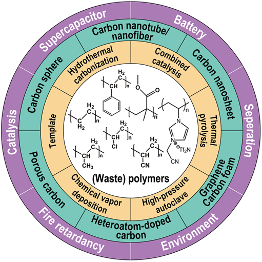 碳材料的形貌、孔结构和化学组成对碳材料性能起到了决定性的作用(Science 2011, 332, 1537)。作者进一步分析了如何调控聚合物碳化产物的物理化学性质,包括形貌、孔结构和掺杂元素。此外,碳材料在许多领域有着重要应用,比如能源存储和环境污染治理(Science 2012, 335, 1326)。作者总结了聚合物可控碳化产物在超级电容器、锂离子电池、吸附与分离、存储氢气、光催化降解有机物等领域中的应用。最后,作者展望了聚合物可控碳化反应研究的未来发展方向和应用前景。归纳起来有四点:第一,进一步提高碳材料的产率。废弃聚合物中往往含有填料、添加剂等杂质,会影响聚合物的降解以及碳材料的生长。因此,开发新型催化剂或者新的聚合物碳化方法是一个重要的发展方向。第二,进一步改善材料的微观结构、提升材料的性能。这就要求制备合适比表面积、孔径分布、掺杂原子和表面官能团的碳材料。第三,进一步降低聚合物碳化温度,提高碳保护层的强度,从而提高聚合物阻燃性能。第四,进一步探索(废弃)聚合物基碳材料的大规应用,比如废水处理、土壤修复和海水淡化。