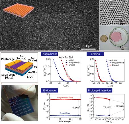 5月21日,《先进材料》在线刊发了团队最新研究成果“Centimeter-scale Inorganic Nanoparticles Superlattice Monolayer with Non-closed-packing and Its High Performance in Memory Devices)” (Adv. Mater. 2018, DOI: 10.1002/adma.201800595)。我校为第一完成单位,化学与化工学院博士后王珂及南京邮电大学博士生凌海峰为共同第一作者,朱锦涛教授与南京邮电大学解令海教授、仪明东教授为论文的共同通讯作者。超晶格是一种具有严格周期性和高度有序性的纳米复合材料。团队成员利用高分子接枝金纳米粒子(组装基元)具有的微弱两亲性,提出了一种新的“油/水界面快速组装”法。随有机溶剂的挥发,纳米粒子在油/水两相界面快速(小于1秒)自组装成大面积的超晶格单层膜(约3×3厘米)。该方法克服了本领域难以构建大面积、非紧密堆积超晶格单层膜的难题,实现了超晶格从紧密堆积到非紧密堆积的转变和超晶格材料晶格常数的大范围调控,为非紧密堆积超晶格材料在微电子、生物传感、光电器件等领域的应用提供了可能。基于此,团队成员与南京邮电大学解令海团队合作,以制备的超晶格单层膜为纳米浮栅层,构筑了一种高性能有机场效应电信号存储器。与传统方法制备的同类型电信号存储器相比,该存储器在存储窗口、维持时间、器件稳定性等方面都表现出优异性能。例如,与传统的无序结构超晶格存储器件相比,该类高度有序超晶格纳米浮栅存储器件的存储开关比可达105,实现了存储态分明的8阶存储特性(即3比特信息存储),并且稳定的存储寿命可达10年以上。