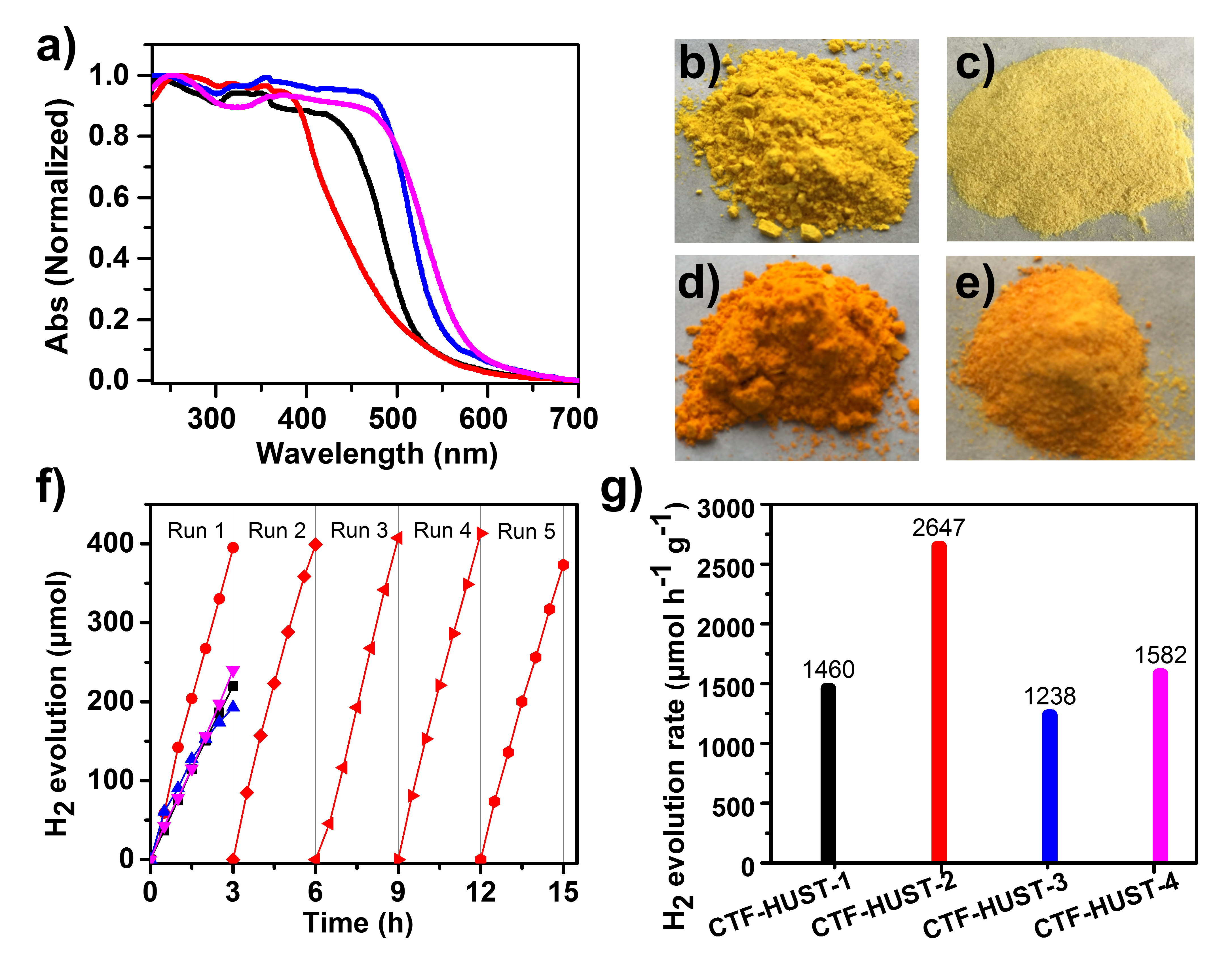 谭必恩教授团队采用了一种全新的缩聚方法作为构建共价三嗪环骨架的新策略, 实现了在低温和简易条件下制备三嗪环骨架材料(CTF-HUSTs)。该类材料具有层状结构,很高的比表面积,更为重要的是,该类材料保持了材料的能带结构,避免了在高温下碳化失去能带结构的缺点。通过光解水测试,发现该类材料具有优异的光催化产氢性能,在可见光下,最大产氢量达2647µmol h-1 g-1,相比同类材料具有很大的提升。由于独特的层状结构,该类材料在碳化之后,还可作为钠离子电池的负极材料,最大充放电容量高达467 mAh g-1。该研究为该类材料的发展提供了一种新的策略,推动了该类材料在该领域的发展。