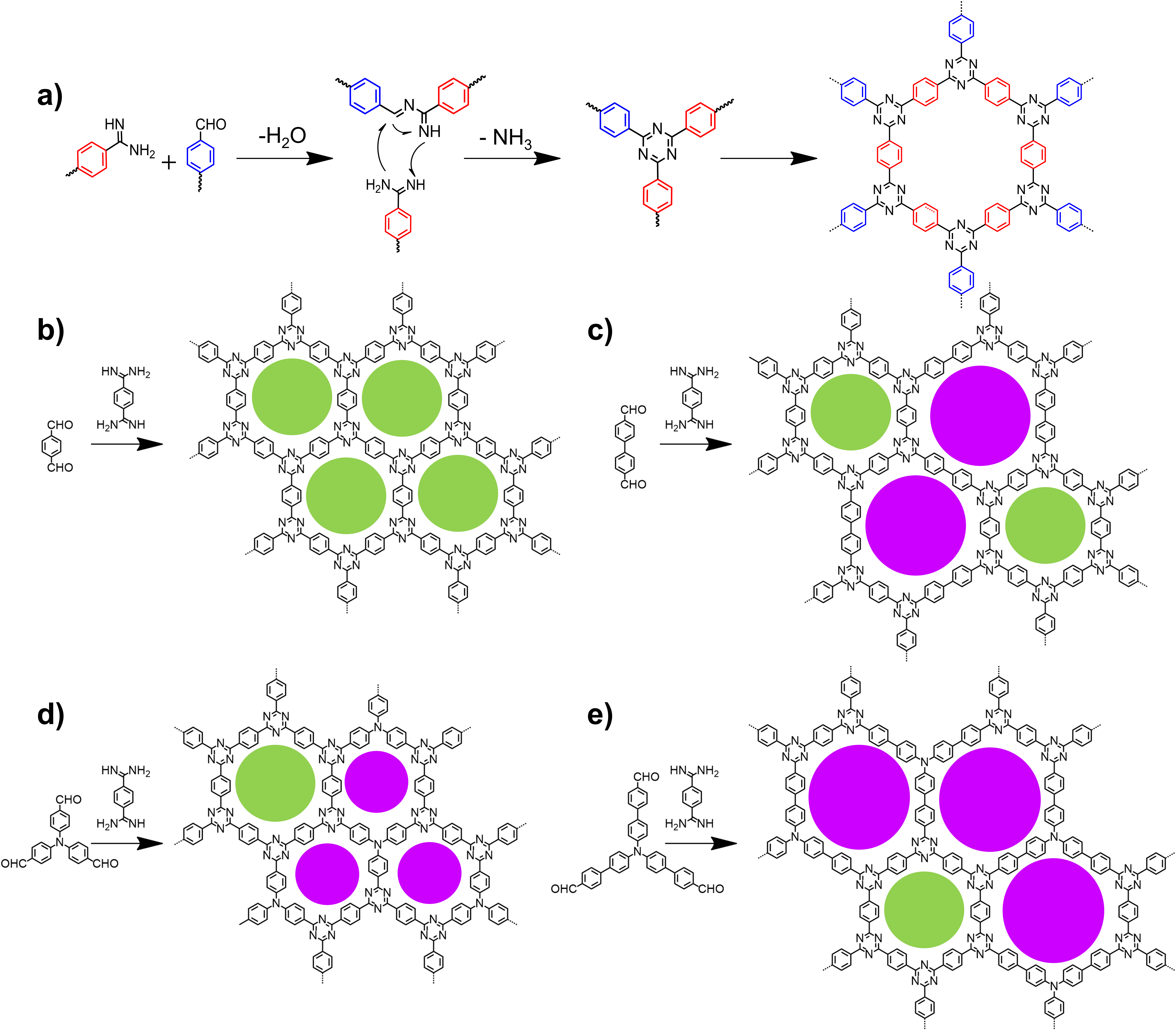 有机多孔材料是最近材料领域的热点研究领域,其中共价三嗪环骨架(CTFs)由于具有丰富的氮原子和稳定的化学结构,在气体分离分离、光催化以及能源储存等领域具有很大的应用前景,然而传统的共价三嗪骨架材料一般通过离子热法或通过强酸催化的方法制备,这些方法制备条件苛刻、单体来源有限,因而限制了进一步发展和大规模制备。