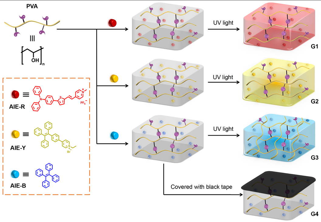 图1. 不同AIE水凝胶的化学结构式和卡通示意图