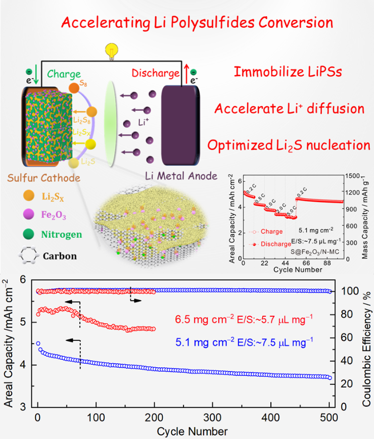 锂硫电池有着极高的理论能量密度,近年来一直受到研究者的青睐,然而受迟滞的反应动力学影响,锂硫电池在高硫载量,贫电解液,大倍率的严苛条件下的实用性进展一直未能取得重大突破。据此,王得丽课题组陆赟,秦金磊等人利用超交联聚合法合成制备了含“亲锂”,“亲硫”双位点的分级大比表面积多孔碳锂硫电池正极材料。该方法合成了超精细的亲硫 (< 5nm)Fe2O3纳米催化剂和亲锂的高导电性氮掺杂多孔碳(Fe2O3/N-MC),其优势包括,1:多孔碳框架能容纳80%的活性物质并缓解了充放电过程中体积膨胀问题;2:Fe2O3-N双亲位点协同促进了对可溶性多硫化物的化学锚定和催化转化;3, 分级多孔结构能加速锂离子的扩散。因此,所制备的Fe2O3/N-MC在高硫载量(5.1 mg cm‒2)和低E/S比(7.5 µL mg‒1)的条件下,1 C下经过500次循环后,仍保留3.69 mA h cm‒2的面容量;在液硫比低至5.7 µL mg‒1时,1 C下可循环200次并保留4.84 mA h cm‒2的面容量. 该文章为高效率固液界面的设计和研究提供了方向,有助于加速实现锂硫电池的实用性进程。