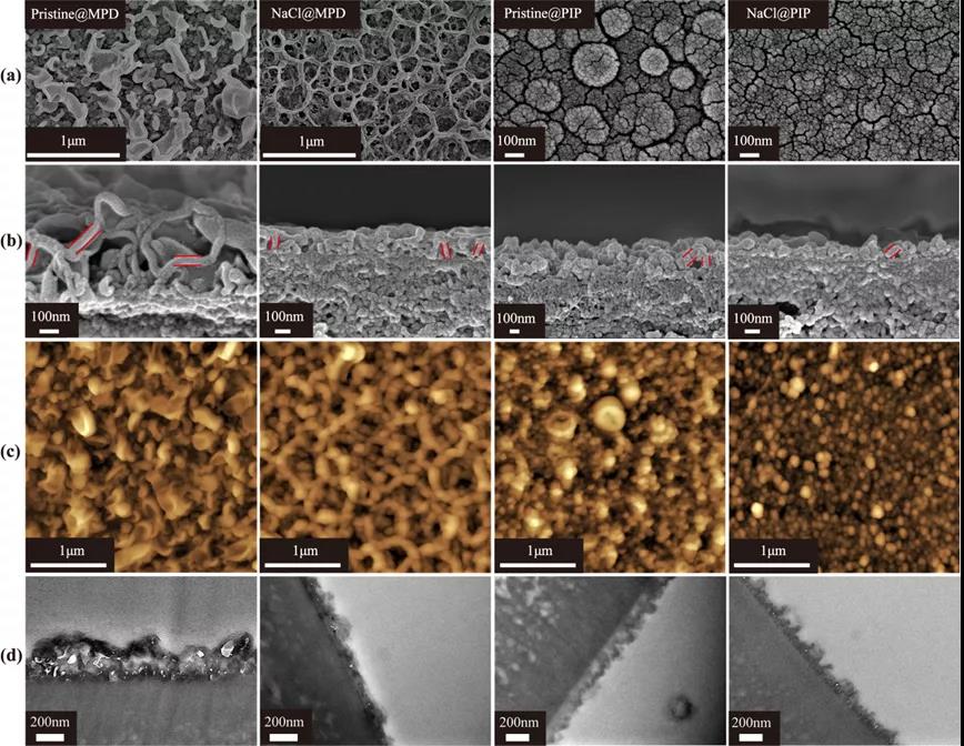 图3 传统界面聚合和无机盐调控界面聚合制备聚酰胺层的微观形貌