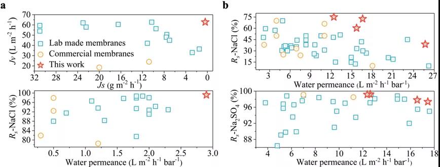 最后,研究者比较了无机盐改性的聚酰胺复合膜同文献报道的聚酰胺复合膜和商业聚酰胺复合膜的分离性能,证实了无机盐改性的聚酰胺复合膜表现出更加优异的分离性能。