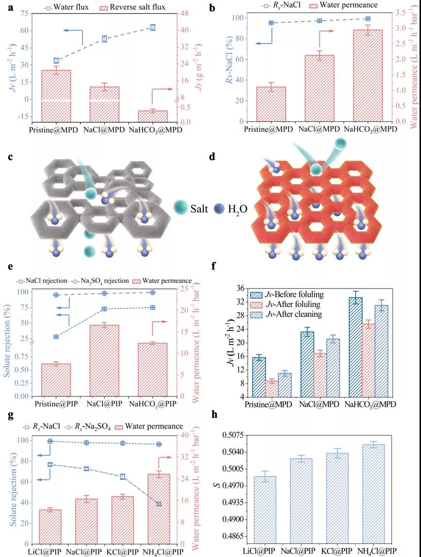 研究者通过将不同的无机盐(如氯化钠、氯化钾、氯化铵、碳酸氢钠、碳酸氢铵)分别加入到不同的胺单体溶液中(间苯二胺、哌嗪、聚乙烯亚胺)制备得到不同的聚酰胺复合膜,并应用到正渗透、反渗透、纳滤过程。发现改性后的膜的水通量/水渗透性得到大幅度提升,同时反向盐通量降低或盐截留率提升,有效地克服了渗透性-选择性的博弈关系(图4a, b, e)。研究者还发现加入无机盐的种类会显著地影响分离性能,为选择合适的无机盐来优化分离性能做出了理论指导(图4g-h)。同时,研究者还发现改性后的膜由于具有更亲水、更光滑的膜表面,因而表现出更加优异的抗污染性能(图f)。