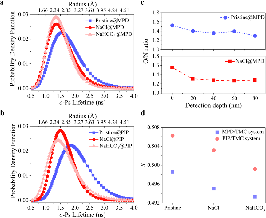 由于无机盐的加入能促使聚合反应能在空间分布上均匀发生,有利于形成在纳米尺度上更均匀的聚酰胺选择层。通过正电子湮灭寿命能谱分析得到改性后的膜具有更均匀分布的纳米孔,而通过传统界面聚合制备得到的聚酰胺层内的孔径分布更宽(图2a-b)。同时,通过XPS深度分析可以发现传统方法制备的中间聚酰胺层的O/N比则在深度分布上呈现出较大的波动变化,而改性膜中间聚酰胺层O/N比在深度分布上变化较小(图2c),进一步证明无机盐的加入能有效地调控聚酰胺层纳米尺度的均质性。