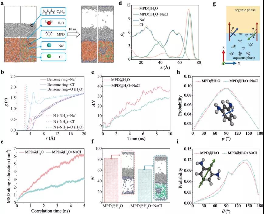通过分子动力学模拟研究发现,无机盐如氯化钠的加入会在油-水界面附近形成聚集(图1a),从而抑制胺单体从水相向有机相的扩散(图1c),一方面减少了扩散到有机相的胺单体数量(图1d-f),促使界面聚合反应区域变窄(图1d),另一方面使得胺单体均匀释放到反应区域(图1e),促使界面聚合反应在空间内均匀发生。另一方面,分子取向分析表明在无机盐加入的体系,胺单体更倾向于朝水相取向,而无盐体系中的胺单体趋向于与水相平行,导致加盐体系中较少的胺单体能有效地与有机相单体发生聚合反应(图1h-i)。