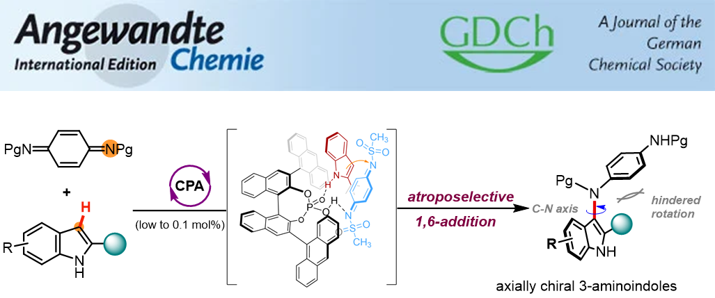 手性吲哚衍生物在天然产物合成、药物研发和材料科学等领域具有重要的用途。这类分子的现有合成研究主要集中在不对称催化傅-克烷基化和芳基化反应,用于制备相应的中心手性和C-C轴手性吲哚衍生物。相比之下,受限于较低的构型稳定性,含C-N手性轴氨基吲哚分子的制备仍是研究难题。对此,钟芳锐教授团队在前期关于醌类化合物不对称催化反应的研究基础上,发现对苯醌二亚胺在手性质子酸催化下能与吲哚发生1,6-共轭加成反应。该反应模式与醌类化合物的经典1,4-加成显著不同,醌二亚胺充当了一种高亲电性的胺化试剂,而非已知的芳基化试剂。基于这一发现,钟芳锐团队通过选择合适的手性磷酸催化剂,首次发展了阻转选择性的醌二亚胺1,6-加成反应,合成了一系列轴手性3-氨基吲哚类分子,催化剂用量低至千分之一,产物的光学纯度高达98%。