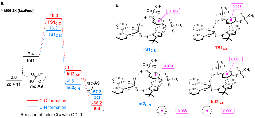 廖荣臻教授团队对该反应的机理进行了理论计算研究。结合自由基捕捉、自由基钟、EPR谱等控制实验,基于密度泛函理论模拟结果,提出上述1,6-共轭加成是通过离子型反应路径进行。此外,与1,4-加成反应的过渡态和中间体能垒及其福井指数和轨道权重福井指数对比,该反应高度专一的1.6加成选择性主要源自于醌二亚胺氮原子显著的亲电性以及过渡态和中间体较高的芳香性。