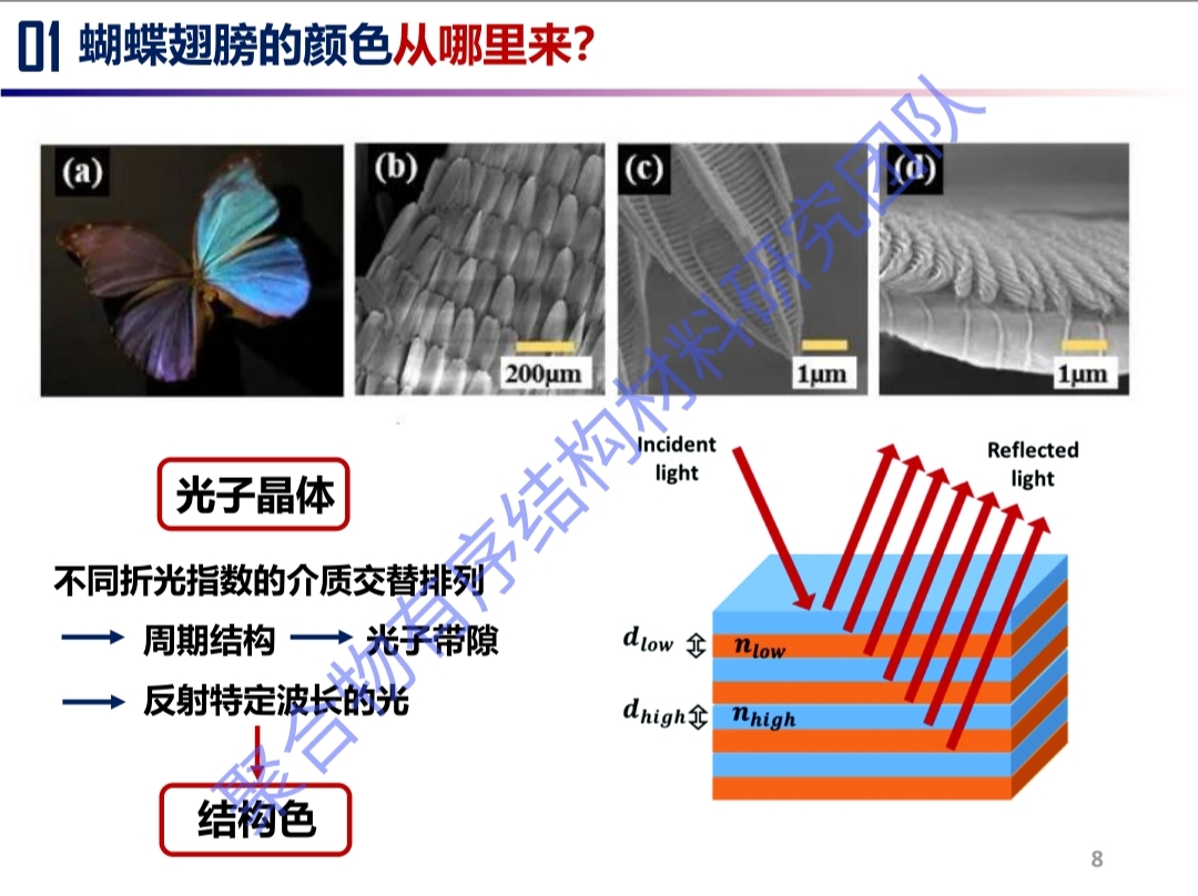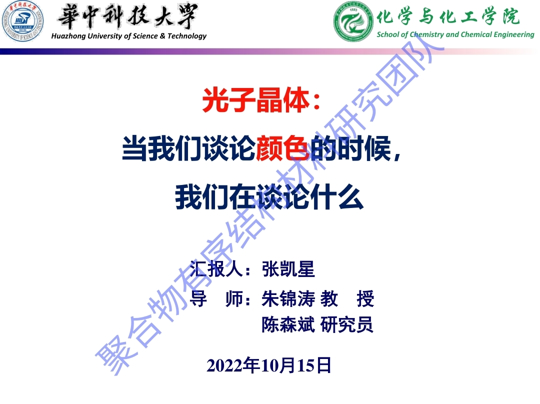 课题组的张凯星学长为我们展现了光子晶体的相关内容。在以光学工程见长的华中科技大学,光学研究备受瞩目。结合有机合成、结构化学等学科的相关知识,利用氢键缔合等方式,通过设计聚合反应、自组装、合成共聚物,最后制得了光子晶体,张凯星学长