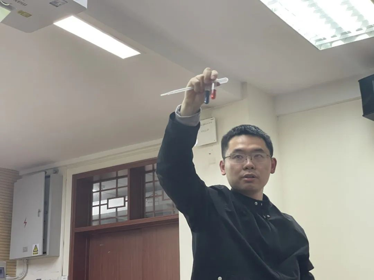 在讲到金纳米材料的相关内容时,刘老师用纳米金溶液和饱和食盐水的演示实验让大家理解相关机理;讲述聚合物微针时 ,刘老师向同学们赠送一些微针样品以及微针做成的美容产品,使同学们更好地理解微针的具体结构和用途。