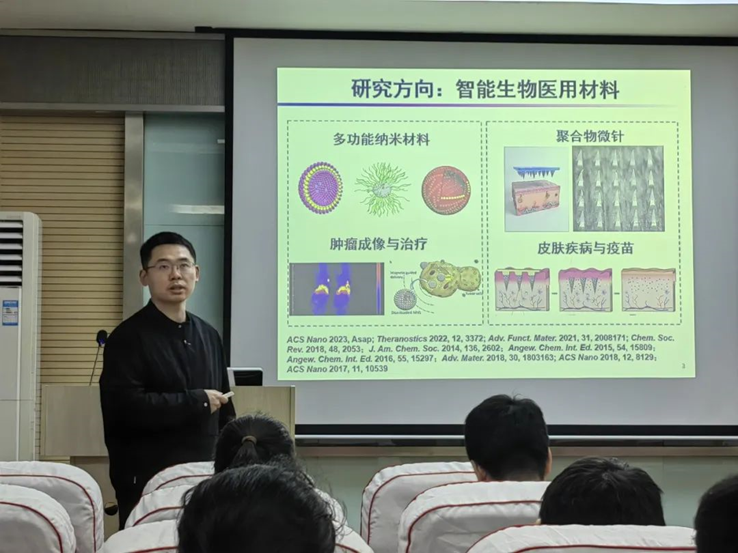 随着人类科技的发展,智能生物医用材料逐渐得到广泛应用。为了增进同学们对这方面领域研究的了解,3月16日,华中科技大学化学与化工学院刘奕静老师给同学们带来了主题为“智能生物医用材料的合成及应用”的讲座,着重介绍了他的两大主要研究方向——功能性仿生纳米药物和聚合物微针的设计与生物医学应用,增强了同学们对功能性仿生纳米药物和聚合物微针的设计与生物医学应用等领域的兴趣。