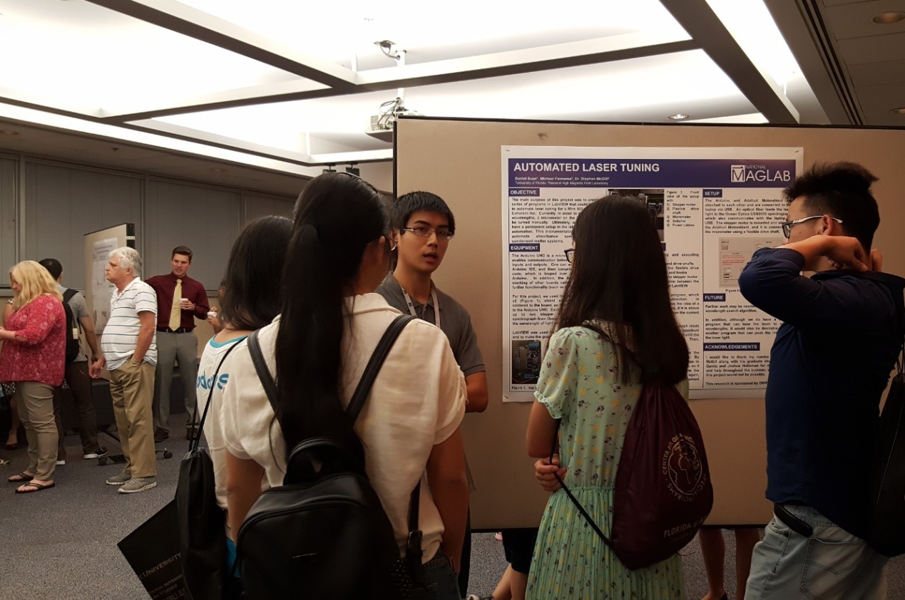 最后的行程是在Mag Lab参加一个本科生的Poster Session,这些大学生来自美国各个大学,利用暑假来到Mag Lab进行科学研究,从环境问题到新型材料的合成,主题涉及各个方向,这些大学生们站在自己的海报面前,非常自信地向前来参观的老师和同学们介绍自己的工作成果。现场氛围十分愉快轻松。各种优秀的想法能够在这个环境很好的碰撞,大家能够更自如地交流讨论,说不定下一个新的idea就在这里诞生了。
