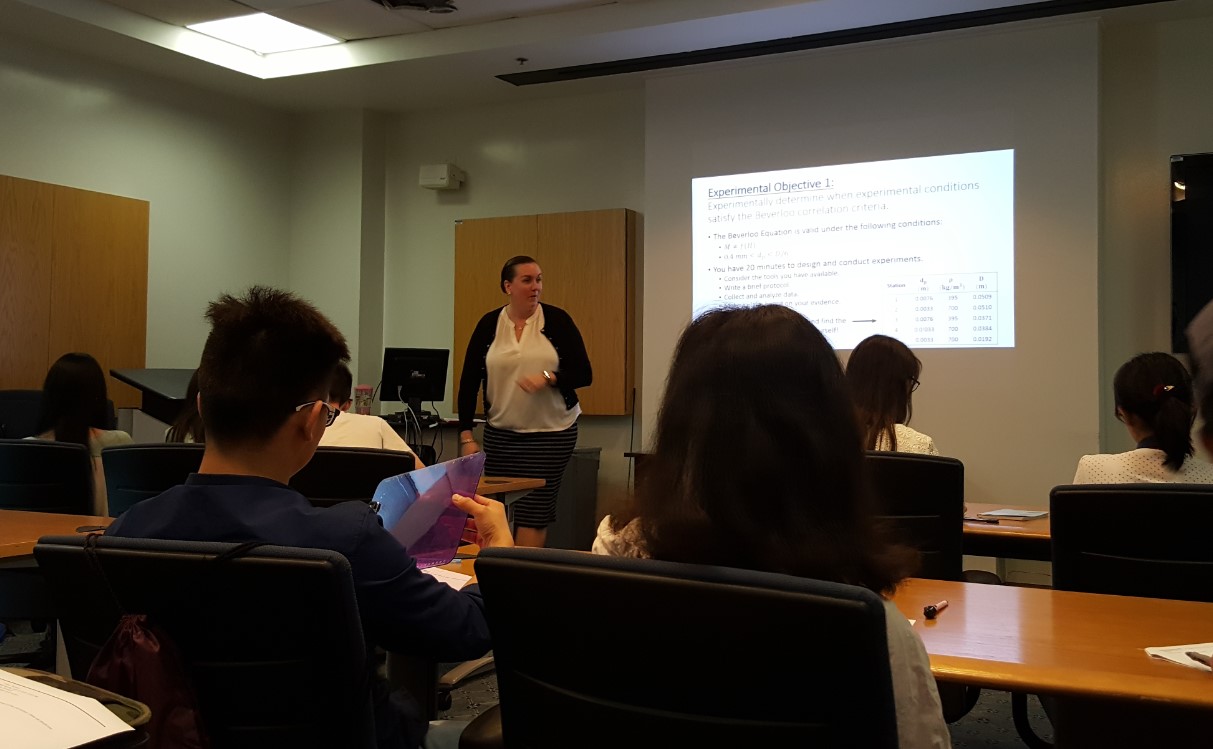 在化学工程系,同学们上了一堂生动的化工原理实验课,研究的是颗粒材料流经漏斗的动力学特征,采用的材质竟然是日常生活中常见的小米和葵瓜子,这和日常在实验室常见的气体、液体流体很不一样。Dr. Hunter首先给同学们介绍了实验的原理,然后让大家分为5个实验小组,通过组员同学们的协同合作,利用测得的多组数据,拟合并验证了Beverloo经验公式,并引导大家分析了各组误差发生的原因和解决问题的方法。