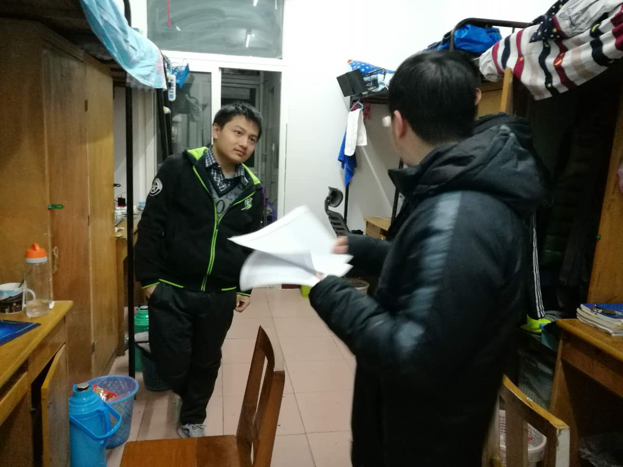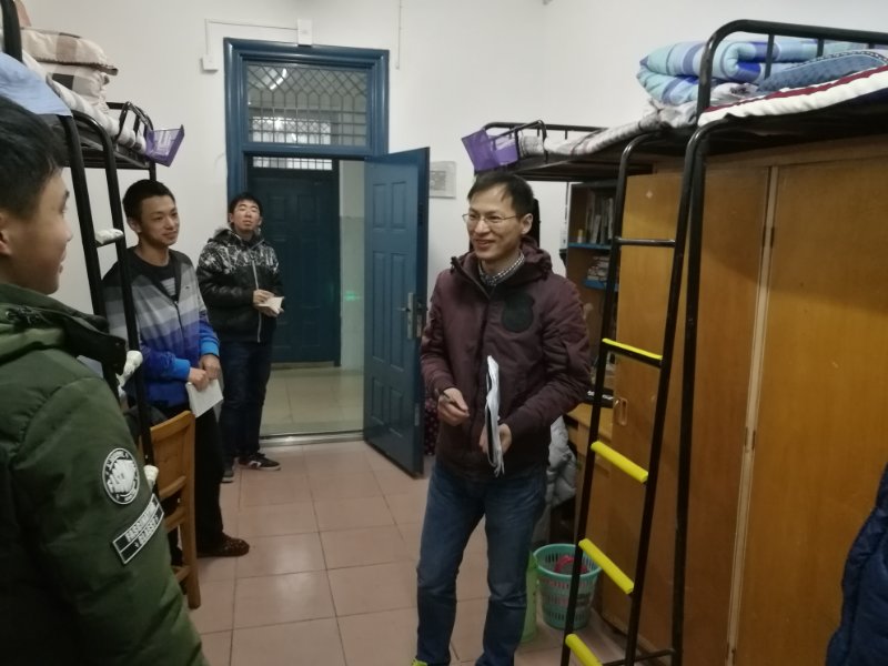 2月23日晚6:30,化学与化工学院党委书记李涛教授、党委副书记吴疆鄂老师、副院长龚跃法教授与各年级教师班主任和辅导员一道,走访学生寝室,检查用电安全,并与各班班长开展了座谈,了解同学们开学以来的思想动态和生活学习中存在的困难。