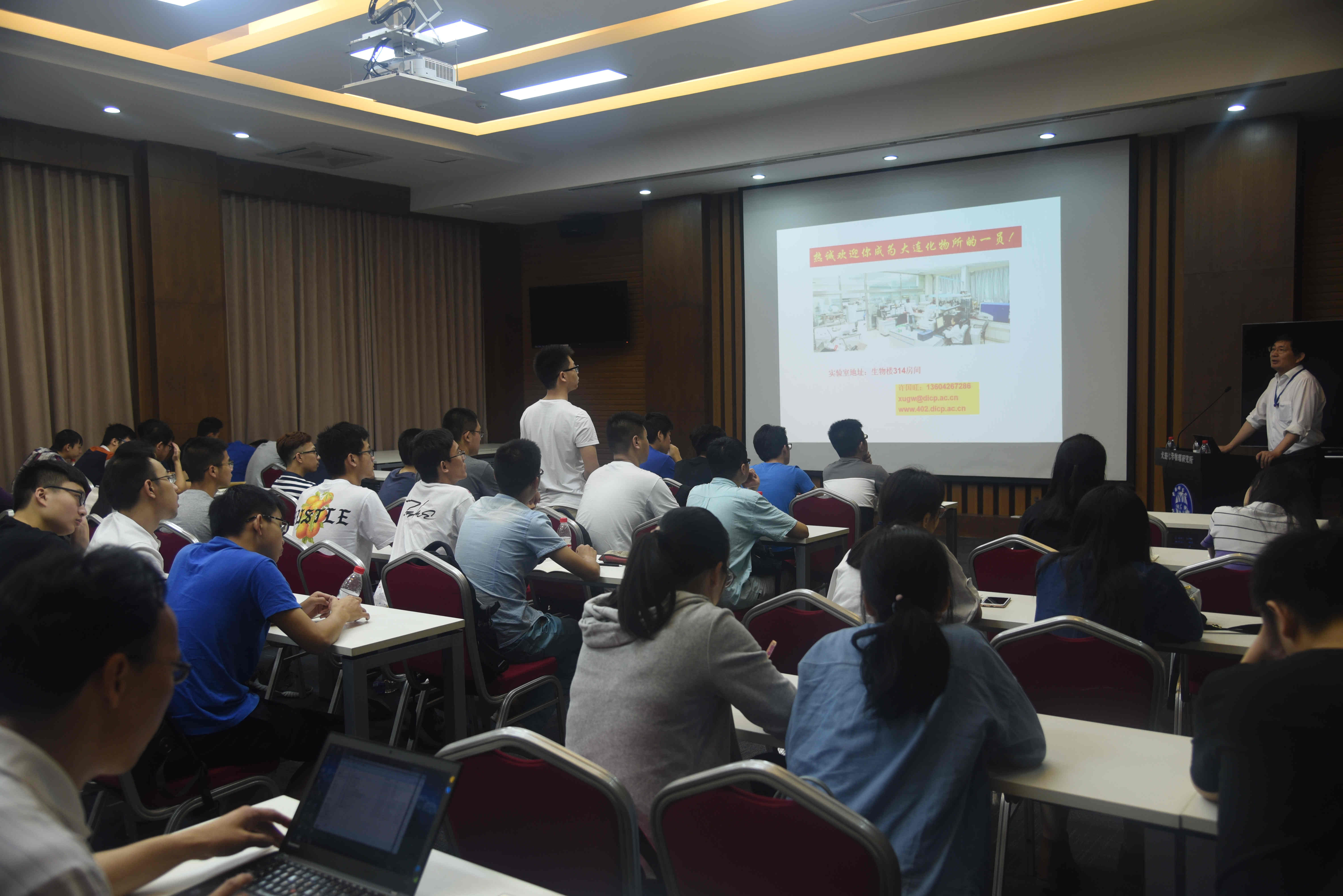 29日清晨,交流团开始了在中国科学院化学“四大所”之一——大连化学物理研究所的学习交流项目。首先,交流团听取了大化所代谢组学研究分析中心许国旺主任关于《多维色谱联用技术及其在复杂样品研究中的应用》的报告。许主任的报告着重讲述了高通量多维度联用的分析系统在科学研究中所起到的巨大作用。随后,大化所研究员傅强先生以氨工业为例讲解了《纳米与界面催化》,并用“脏、乱、差”三字形象而诙谐地描述了催化反应的特点。紧接着,杨铎老师就大连、大化所的概况及所内招生政策中的有关问题一一做出了解答。为加深交流团对科普报告的理解,许国旺主任和傅强研究员分别邀请交流团进入生物技术部高分辨分离分析及代谢组学组和催化基础国家重点实验室进行了观摩学习。