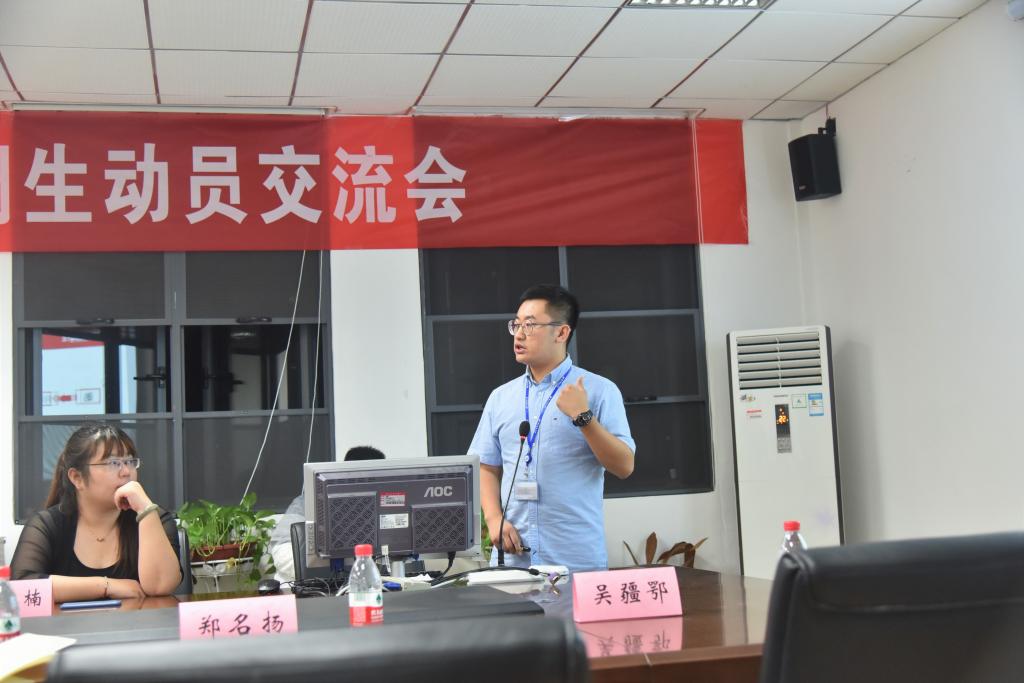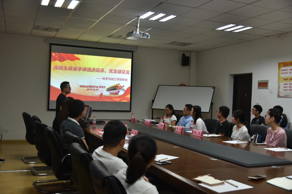 为认真贯彻落实党的十九大精神和全国高校思想政治工作会议精神,进一步推进我院选调生工作,引导我院研究生服务国家重大战略需求,9月25日晚,2018年化学与化工学院选调生动员交流会在东三楼321会议室成功举办。出席会议的嘉宾有化学与化工学院党委副书记吴疆鄂、研工部就业指导中心郑名扬、化学与化工学院研究生辅导员许愉梓,会议由化学与化工学院研究生就业德育助理邵太康主持。