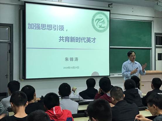 朱院长从习近平总书记对青年的期望谈起,探讨了“一个现象——英雄坟前无人问,戏子家事天下知”,列举妙手仁心吴孟超、钢铁院士崔崑、英雄校友黄群、舍己救人胡吉伟等先进事迹,告诫同学们要崇拜真正的偶像;提到了“一个警报——武汉沦陷日防空警报”,带领同学们回顾了中华民族的屈辱史和老一辈的艰苦奋斗史,告诫同学们牢记历史,勿忘国耻,以史为鉴,坚定“四个自信”;展现了“一个好时代——新时代”,引用十九大新论断,告诉同学们“我们比历史上任何时期都更接近中华民族伟大复兴的目标”,告诫同学们脚踏实地,成为伟大时代的践行者、创造者;展示了“一封信——学院本科生来信”,期望同学们多思考,树立主人翁意识,爱校荣校;提出了“一个问题——如何成为社会主义事业的合格建设者和可靠接班人”,引导同学们自我探索,树立远大理想,制定大学规划。最后朱院长祝愿同学们能过度过一个快乐、充实、成功的大学时代。
