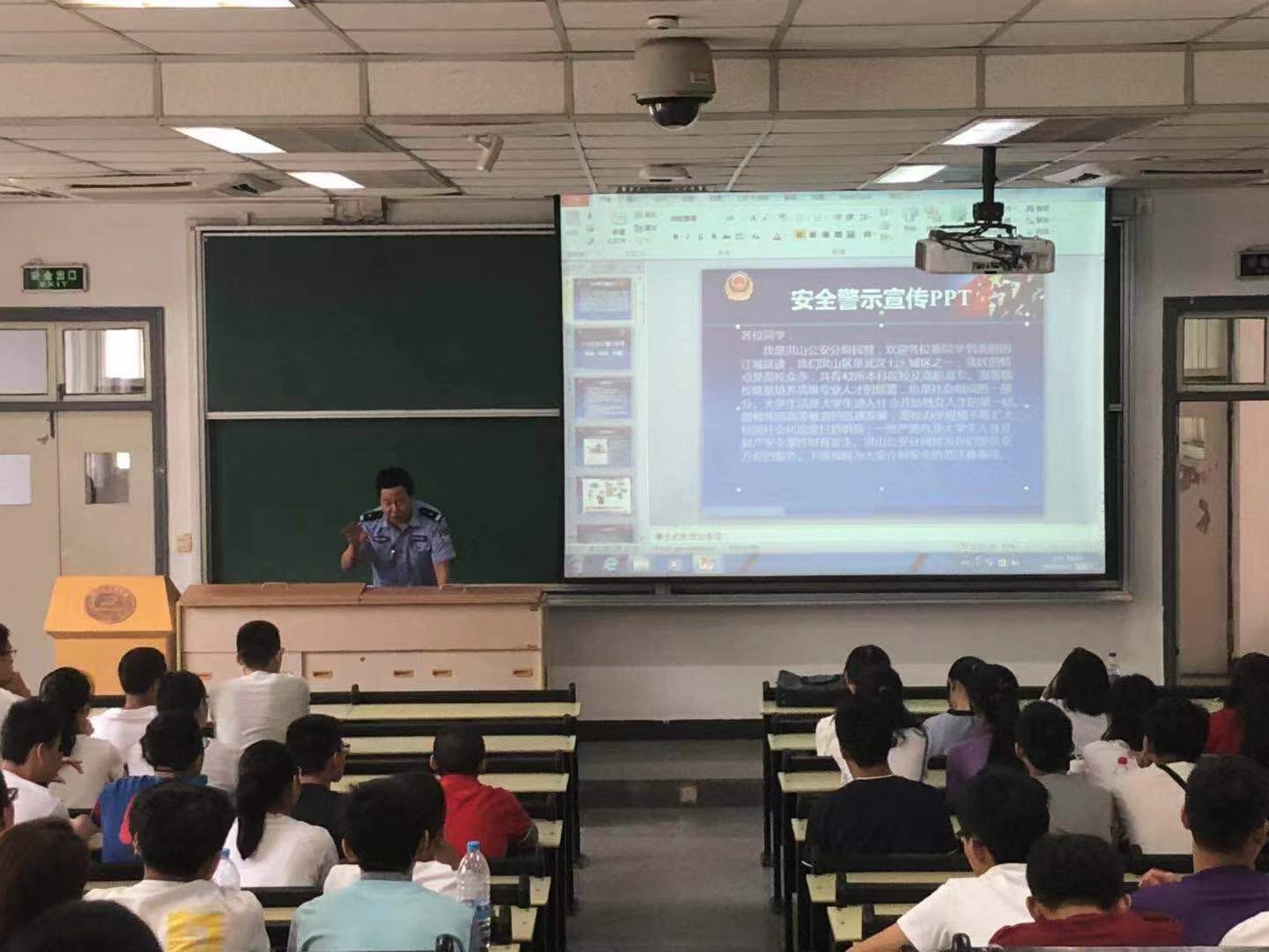 最后,来自喻家山派出所的熊家伟警官为同学们做防盗防骗教育。熊警官细致地为大家讲解了常见的骗子招数与同学们应该掌握的防骗手段,分享了许多发生在大家身边的受骗被盗案例,用诙谐幽默的语言为大家上了生动的一课。