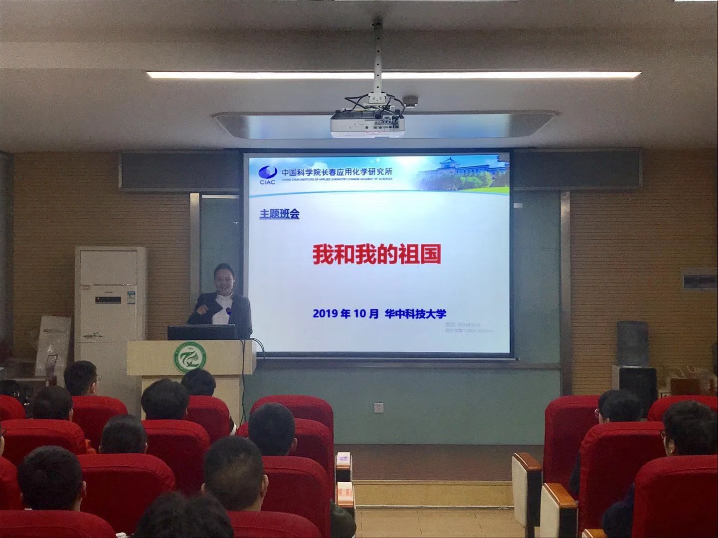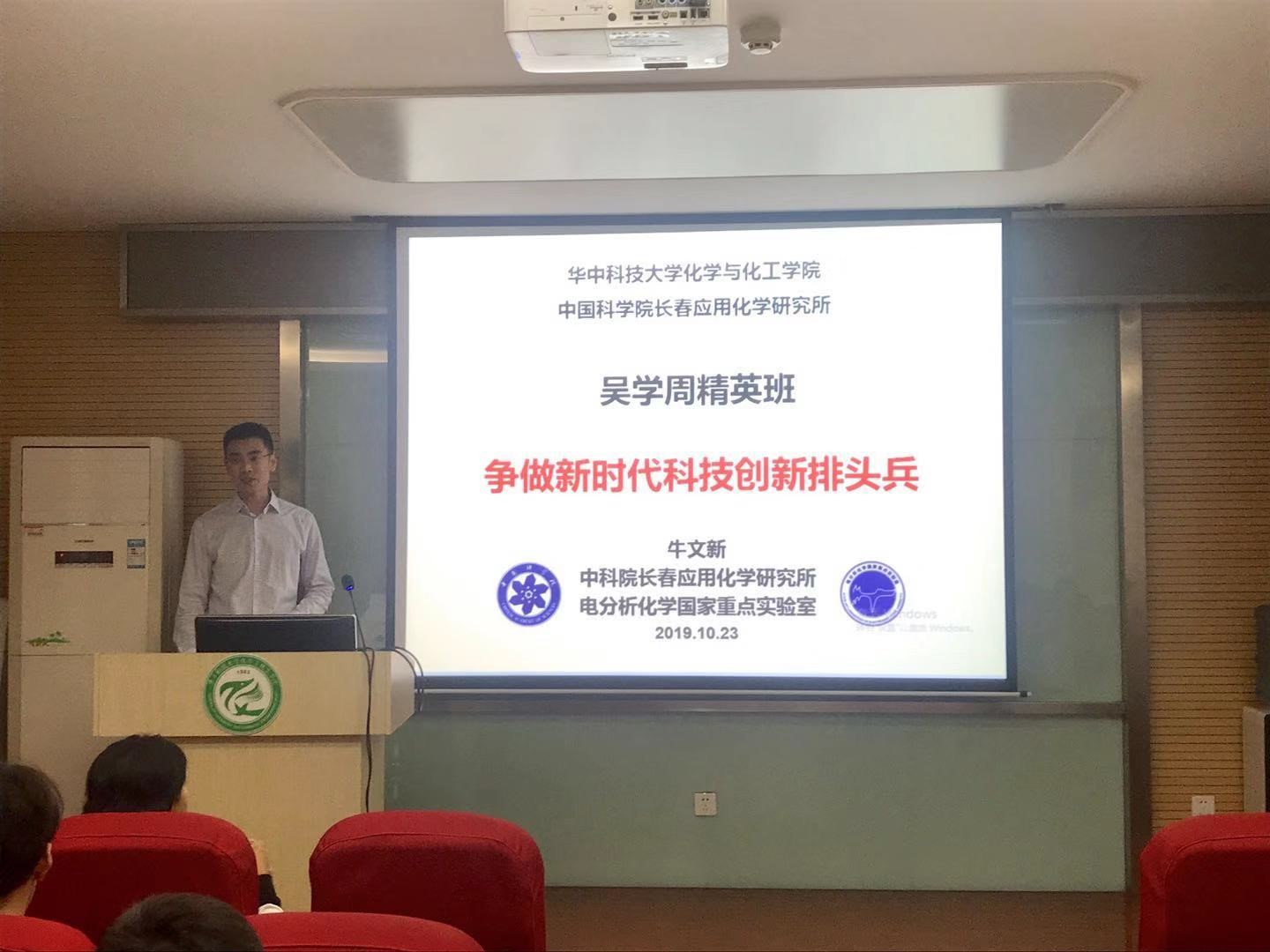(通讯员:刘赵昊旻)2019年10月23日晚7:00,在2019级吴学周精英班面试选拔结束后,中国科学院长春应用化学研究所研究生部刘靖宇主任,2019级吴学周精英班班主任、国家四青人才、中科院长春应化所牛文新研究员做客我院,开展2019年吴学周精英班主题班会暨第一课。化学与化工学院党委副书记吴疆鄂、辅导员孙健康、刘赵昊旻与2017、2018、2019级吴学周精英班的同学们一同参与班会、聆听报告。在刘靖宇老师的带领下,开展了以“我和我的祖国”为主题的新学年班会;牛文新老师则为同学们讲述了以“争做新时代科技创新排头兵”为主题的第一课。两位老师将思政与学术相融合,让理想信念教育与科学研究指导同频发声,为在场同学带来了精彩而难忘的一课。