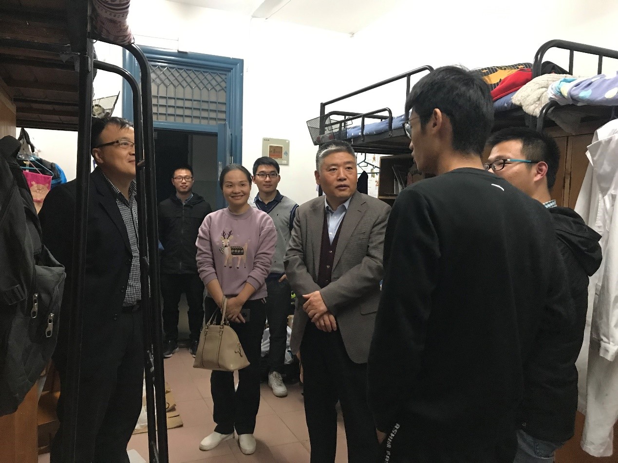 随后梁校长一行来到了李龙祥的寝室,了解同学们的住宿情况,询问李龙祥与室友平时在寝室的活动、日常作息等。离开宿舍后,梁校长还与紫菘十栋的宿管黄阿姨亲切交谈,了解了宿舍管理工作相关情况。梁校长表示阿姨平时工作十分辛劳,宿管的工作看似平凡,却很重要,可以为学生做的很多,也会被学生记挂在心。希望宿管能够向韵苑19栋的金林君阿姨看齐,将学生们视为自己的孩子,成为学生最亲近的人。