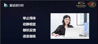 针对视频面试需要注意的具体事项,如设备的选择调试,面试环境的选择,形象、语音、肢体动作的控制等问题,裴老师逐条进行了讲述,并列举了诸多实例以带领同学们对视频面试中的常见问题进行深入剖析,引导同学们准确把握面试官真正关注的应聘者能力和人岗匹配度。