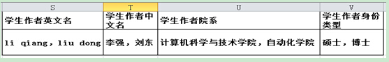 请将所有属于学生的作者信息全部填入学生作者信息栏(S-V列),有几个学生作者,就需要填入几个学生作者的信息,之间用“逗号(,)”隔开。如某篇论文中有“李强、刘东”为我校学生,分别是计算机学院与自动化学院,李强是硕士,刘东是博士,则填写如下: